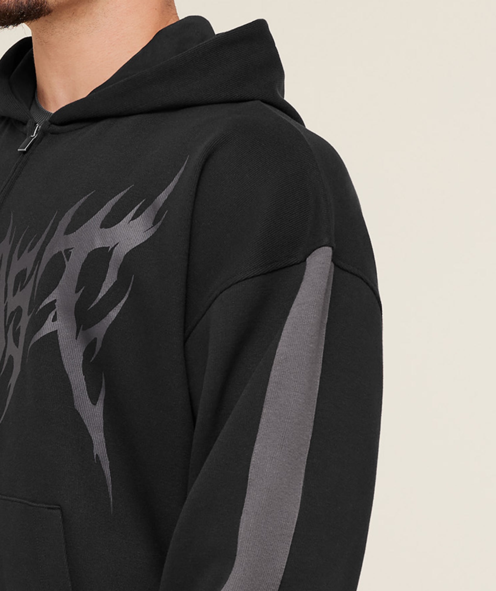 Designed for standout comfort with an oversized fit that enhances your silhouette, featuring an exclusive Carlos Belcast graphic, contrast arm panels, a double-layer hood, a kangaroo pocket and a full zip.